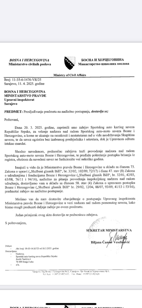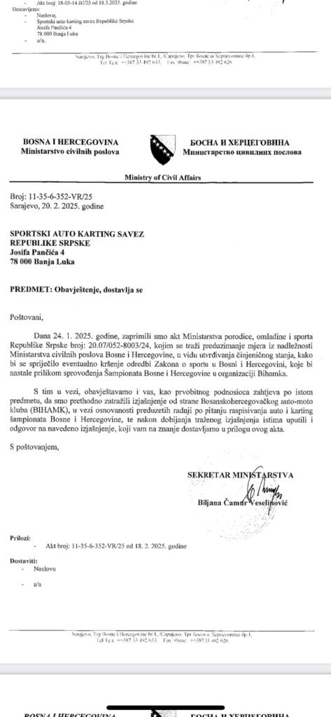 Спортски ауто картинг савез Републике Српске обраћа се овим путем јавности Босне и Херцеговине желећи да исту упозна да је Министарстсво цивилних послова Босне и Херцеговине потврдило да БИХАМК не може организовати ауто и картинг шампионат у Босни и Херцеговини у 2025. години.
