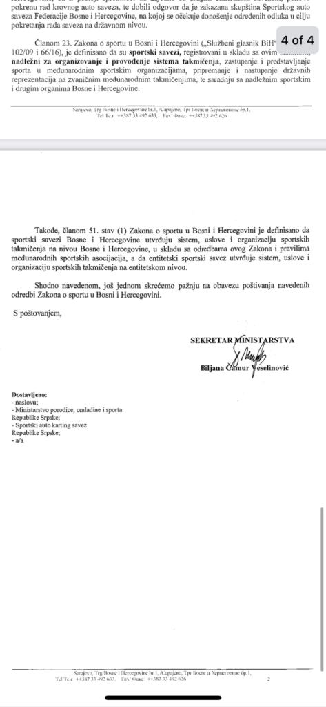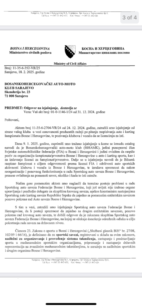 БИХАМК је овим путем упозорен да према Закон о спорту у Босни и Херцеговини („Сл. гласник БиХ“ бр. 27/08, 102/09 и 66/16), није надлежан да распише и организује ауто и картинг шампинат Босне и Херцеговие, као ни да издаје позиве клубовима и возачима да се лиценцирају, већ да то искључиво могу обављати спортски ауто у картинг савези.